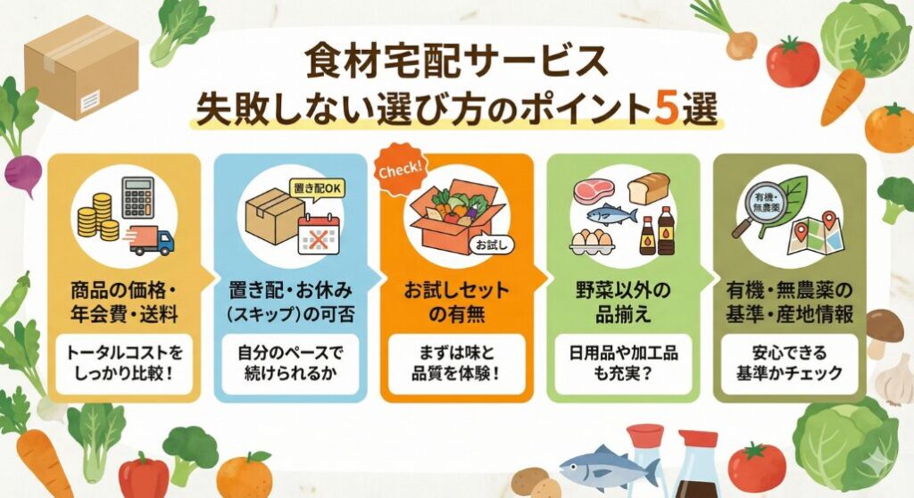 食材宅配サービスを選ぶときのポイントは下記の5つです。